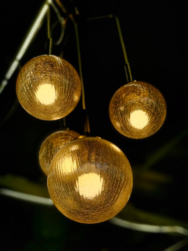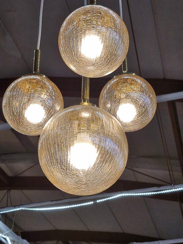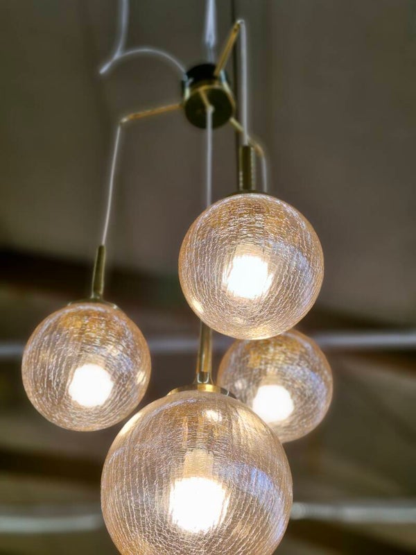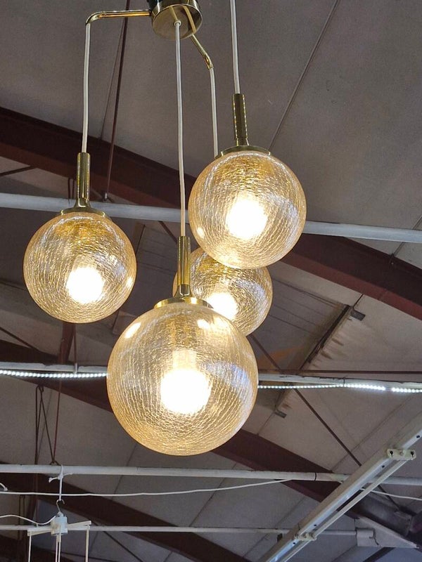 Prachtige vintage kroonluchter / luster uit de jaren 70 met een messing armatuur en champagne kleurige glazen bollen (4). De glazen bollen zijn bewerkt en geven heel mooi sfeervol licht. Er zijn een grotere en drie kleinere bollen. In erg goede vintage conditie.
