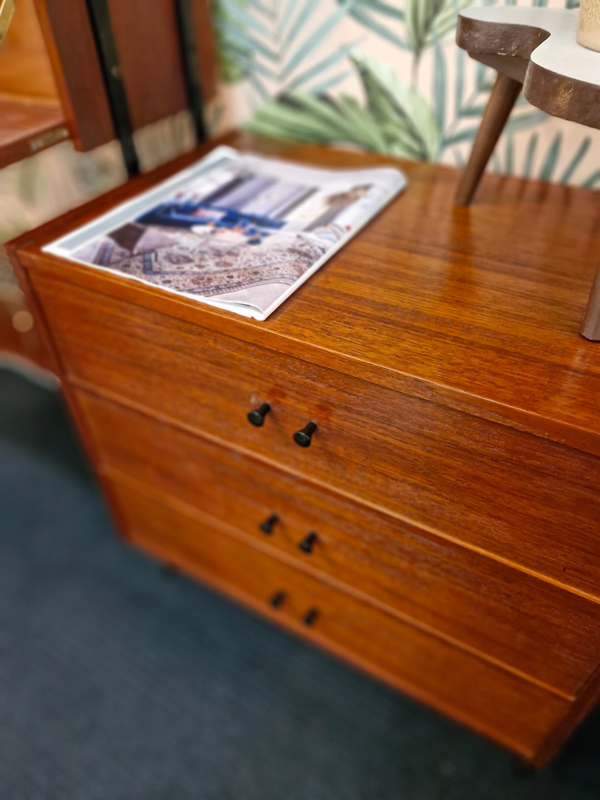 Dit wandsysteem is in mooie vintage conditie. Een lichte verkleuring op de binnenkant van de klep (secretaire deel) en een wat donkerder plekje op het ladenblok. Verder uitstekend.