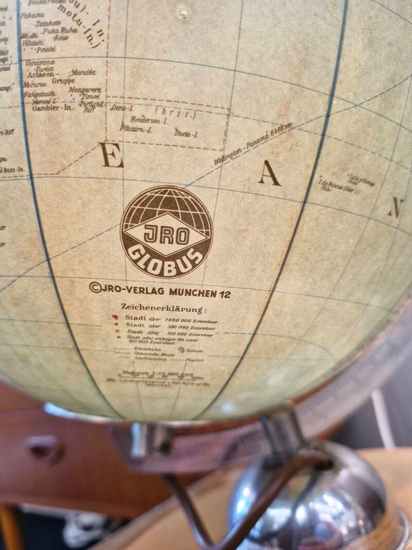 Mooie vintage globe / wereldbol van JRO uit Munchen, jaren 60. De bol is gemaakt van glas, de voet van hout. Verlichting werkt nog en geeft erg mooi zacht licht. Lichte gebruikssporen op de bol maar gezien zijn leeftijd zeker nog in mooie vintage conditie.