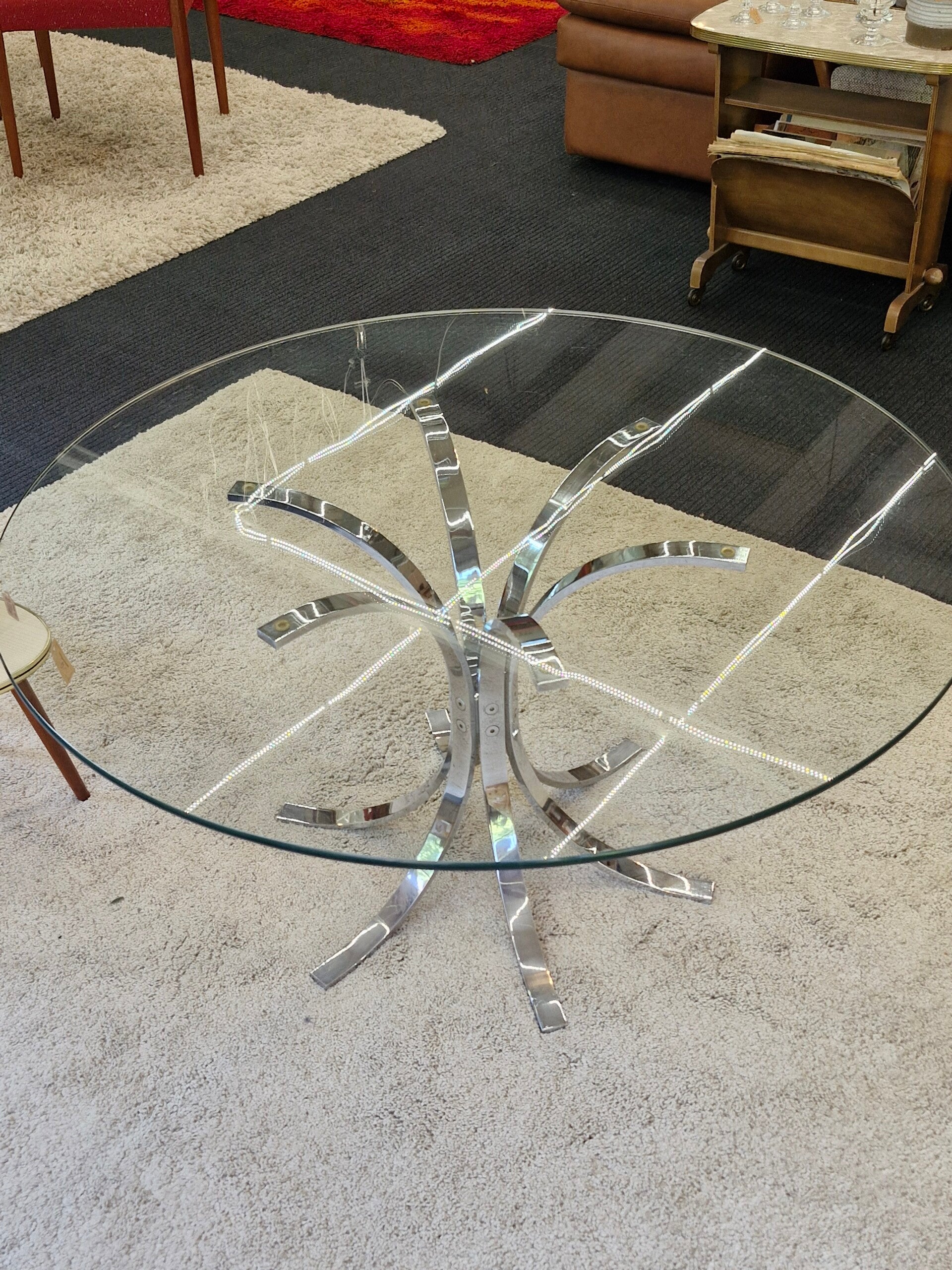 Erg mooie space age salontafel uit de jaren 70. De prachtige gebogen lijnen van de chromen voet en de transparante glazen ronde plaat maken het tot een blikvanger van jewelste. Deze salontafel verkeert in bijzonder goede vintage conditie, nagenoeg geen gebruikssporen.