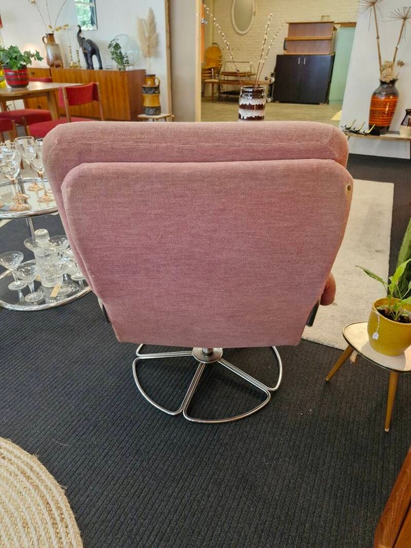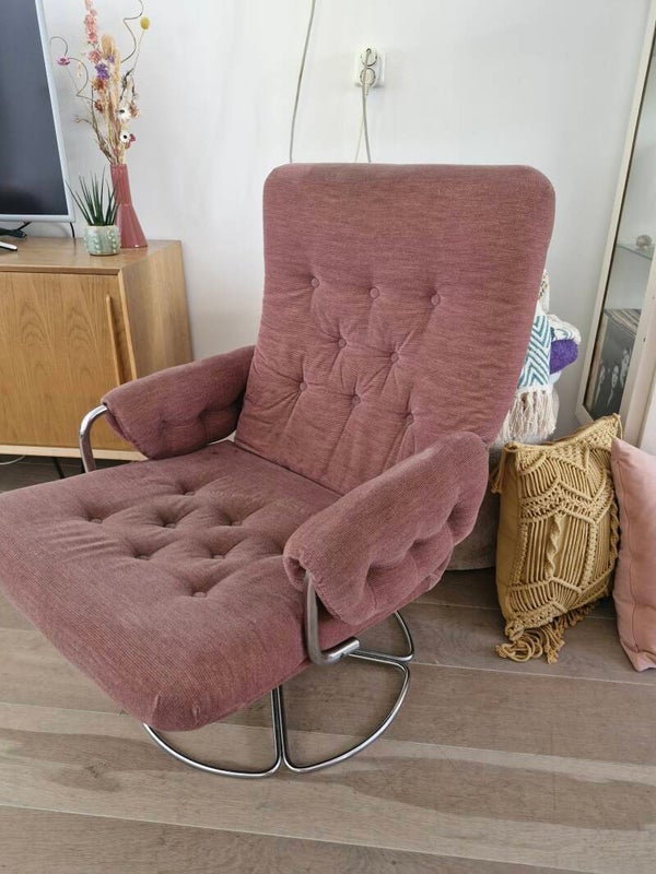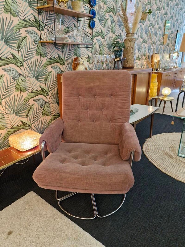 Super leuke vintage faueuil uit de jaren 70 met ronde chromen voet en nog met de originele oudroze ribstof bekleding. Heerlijke zit, zachte stof en nog in mooie conditie.