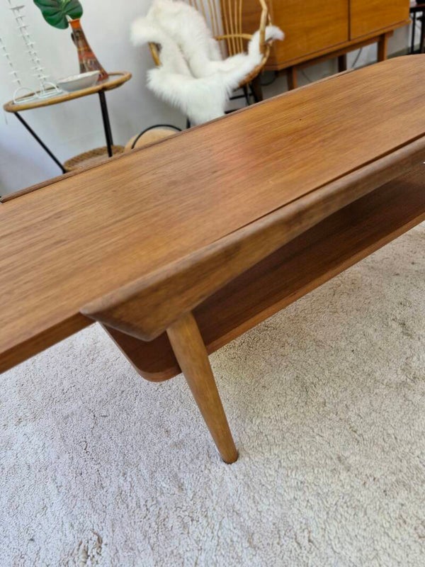 Prachtige vintage salontafel uit de 70s met omkeerbaar tafelblad. De 'nette' zijde is van teak fineer, de 'gewone kant voor overdag' is van gemarmerd formica. Handig extra blad eronder voor tijdschriften. Deze coffee table is in topconditie.