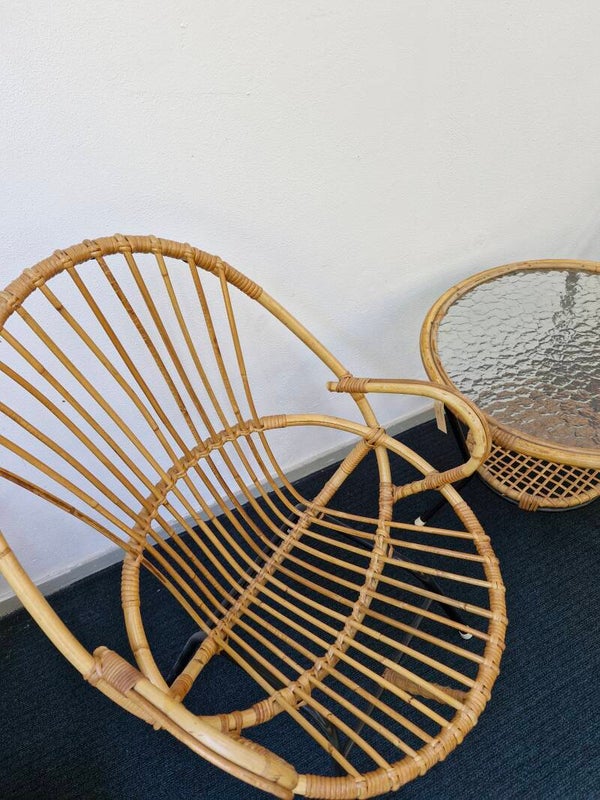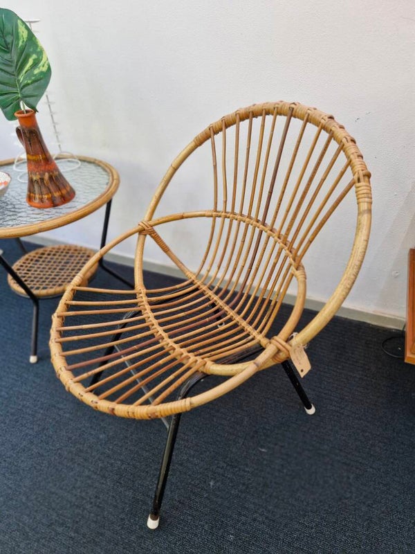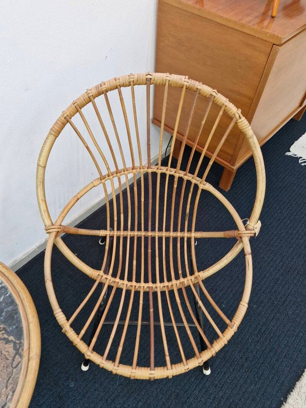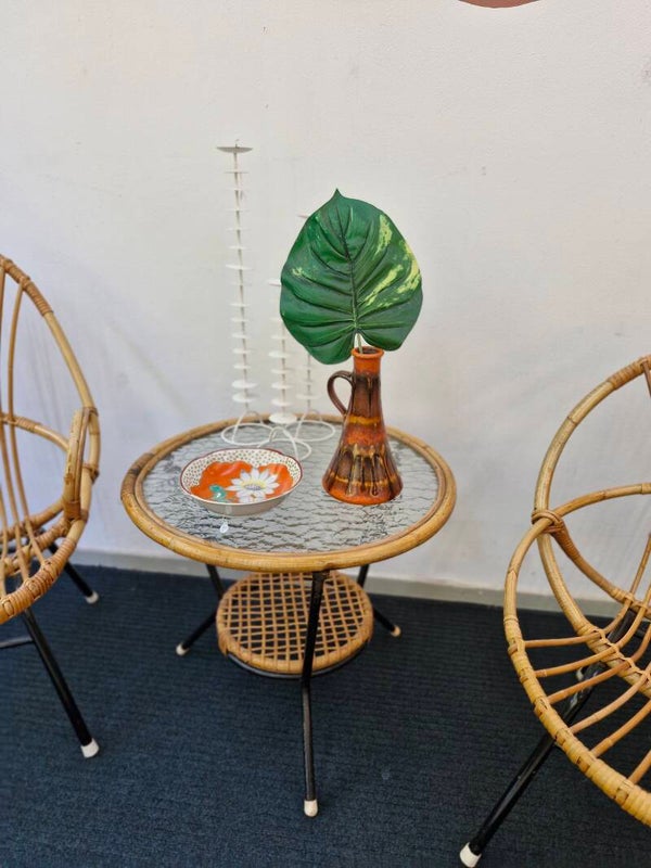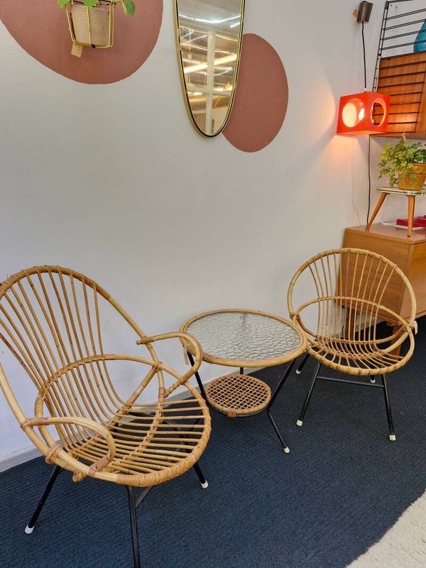 Leuke set van twee rotan stoeltjes en tafeltje uit de 60s van Rohe Noordwolde. De stoeltjes zijn allebei in goede vintage staat en het tafeltje met het gewolkte glas ook. Het rotan aan de onderzijde van het tafeltje is nog geheel intact. Leuk voor op een tienerkamer! Prijs is voor de hele set.