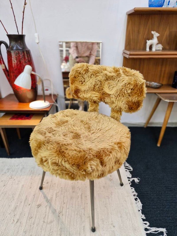 Geweldig leuke eyecatcher dit mooie stoeltje uit Frankrijk. Jaren 60 met prachtig vormgegeven ronde metalen pootjes, allemaal nog met de originele dopjes. De bekleding is van pluche okergeel. Afneembaar dus ideaal om te wassen. Stevig, er kan gewoon een volwassen persoon op zitten en in erg mooie vintage conditie.