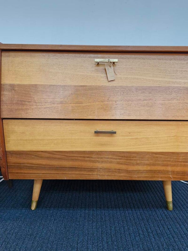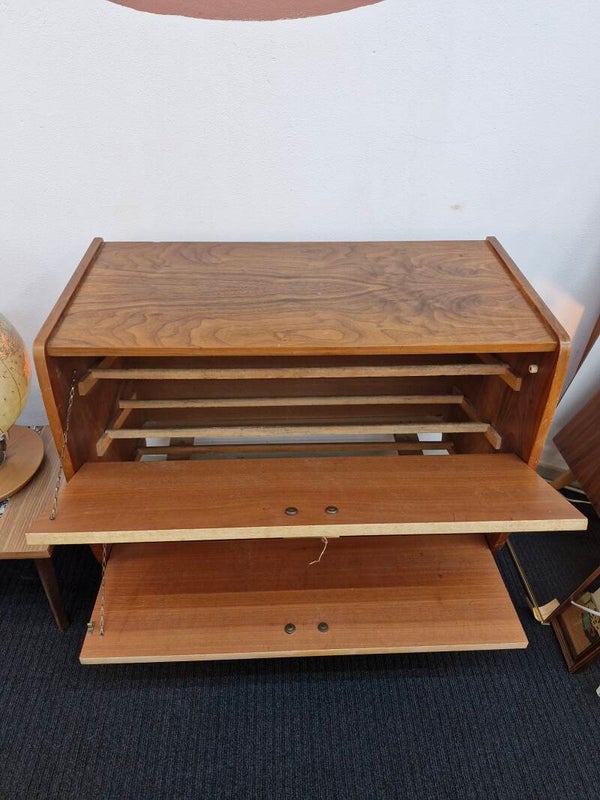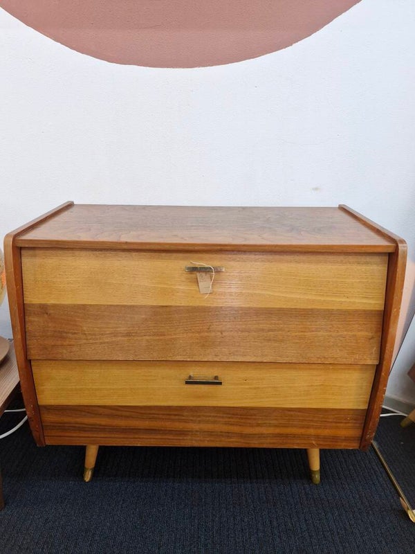 Erg leuke vintage schoenenkast, klein model op houten ronde pootjes die iets schuin staan en messing greepjes. Jaren 70 en nog in zeer goede vintage conditie.