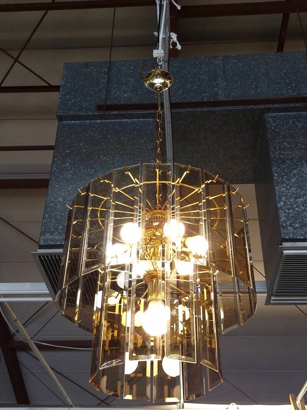 Grote vintage kroonluchter met messing frame en twee ringen met rookglazen plaatjes. Deze Hollywood Regency parel geeft schitterend licht en is een geweldige blikvanger in je vintage of eclectische interieur. Hij heeft maar liefst 5 fittingen. Uiteraard kunnen er ook dimbare peertjes in zodat je hem zacht of helder kunt laten schijnen. Deze lamp is in topstaat. Alle glasplaatjes helemaal intact, geen chips of krasjes.