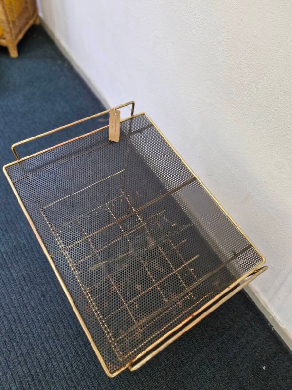 Erg leuk klein platenmeubel uit de jaren 60/70 in Pilastro stijl. Frame is van messing en het blad van metaal. Hier en daar wat roestplekjes, enige gebruikssporen waar de prijs ook op is afgestemd. Desalniettemin een erg leuke vintage aanwinst!