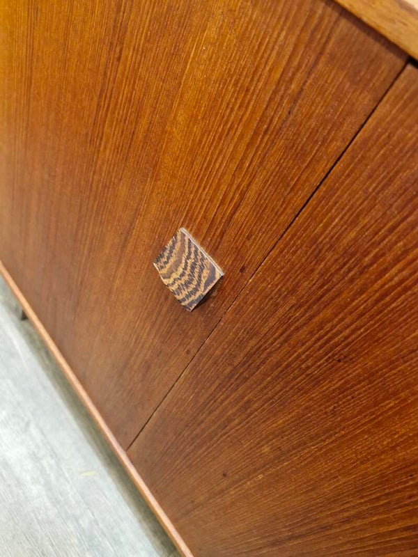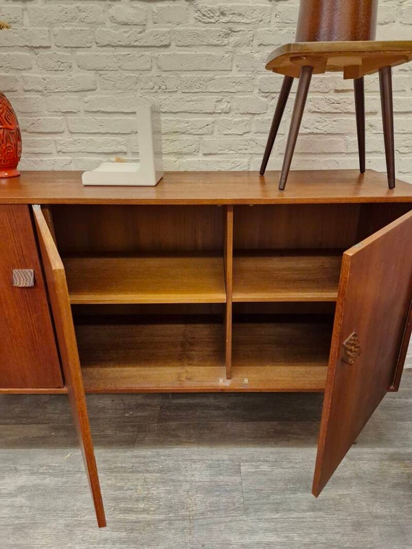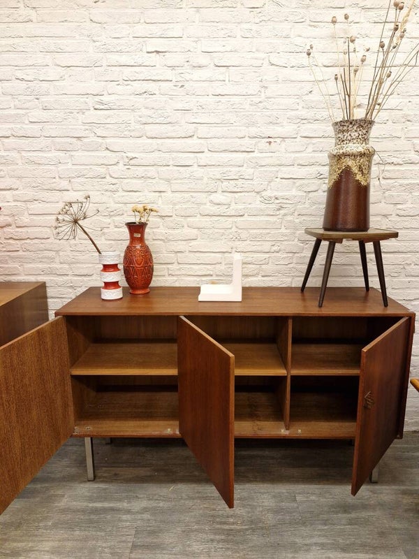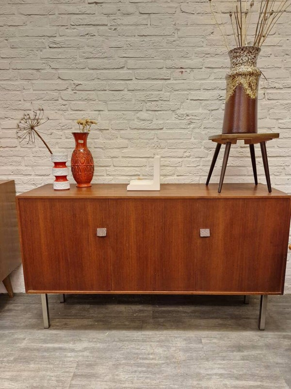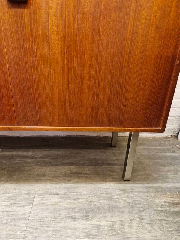 Prachtig strak uitgevoerd dressoir uit de seventies met mooie kleine vierkante houten greepjes en op chroom kleurige metalen poten. Achter de deurtjes bevinden zich extra legplanken. Dit dressoir is in zeer goede vintage conditie.