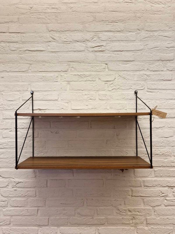 Leuk vintage wandrekje / boekenrekje uit de seventies bestaande uit teakfineer planken en zwart metalen ladders. In goede vintage staat, lichte gebruikssporen, kleine fineerschade op de randjes.