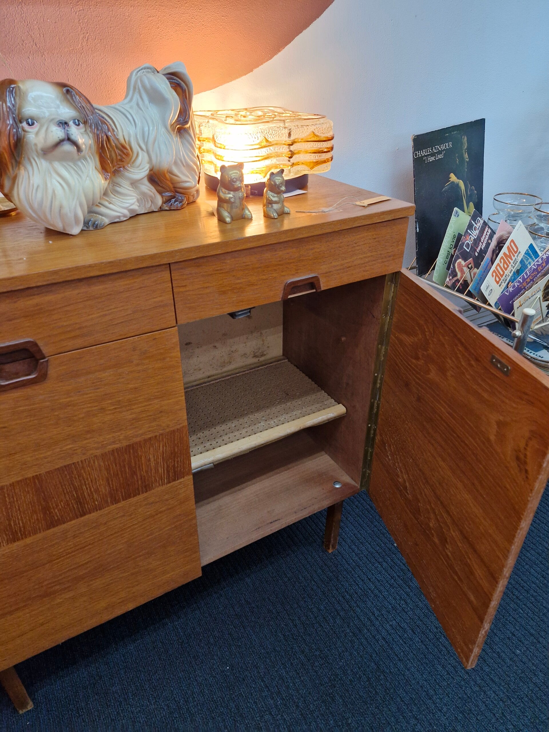 Bijzonder leuk vintage retro schoenenkastje / halkastje met twee lades en doorlopende strakke zwarte greepjes uit de jaren 70. Teak fineer en een plank binnenin voor schoenen en staat op houten pootjes. Apart exemplaar in mooie vintage conditie, weinig gebruikssporen, passend bij de leeftijd.