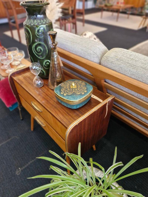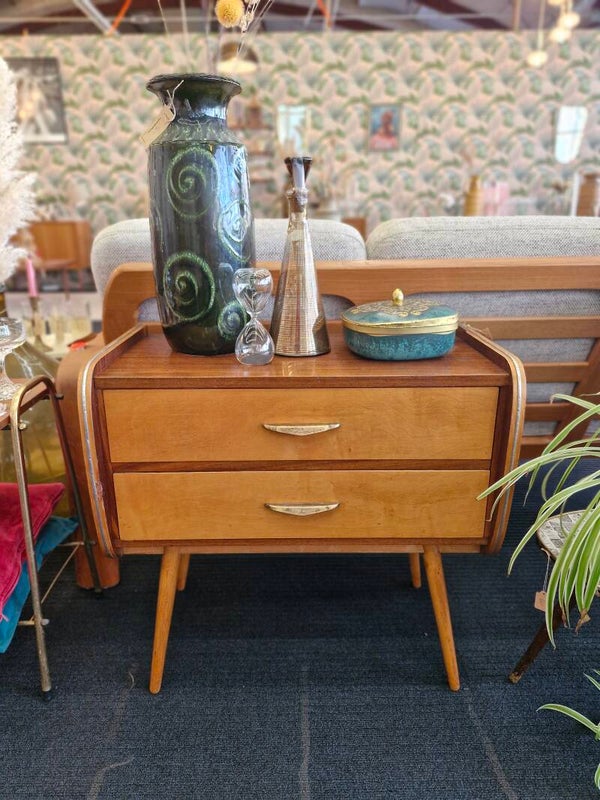 Mooi vintage retro kastje uit de seventies op conische pootjes en met twee lades. Messing greepjes en de organische lijnen maken het een stijvolle opberger. Ideaal voor in de hal maar kan ook als nachtkastje. Dit kastje is in goede vintage conditie. Lichte gebruikssporen passend bij de leeftijd.