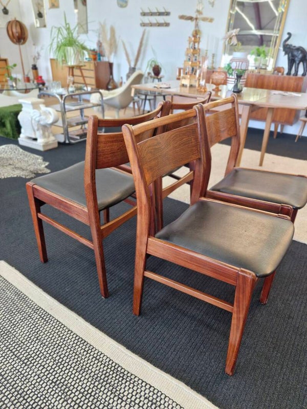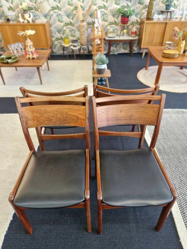 Mooie set van vier vintage eetkamerstoelen. Frame van palissander en de zitting is bekleedt met zwart skaileer. Herkomst Nederland jaren 70, ontwerper onbekend. Maar van degelijke makelij. In mooie vintage conditie, slechts op 1 zitting is een zeer klein gaatje te zien in de bekleding. Prijs is voor de set van vier stoelen.