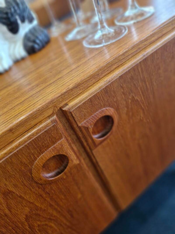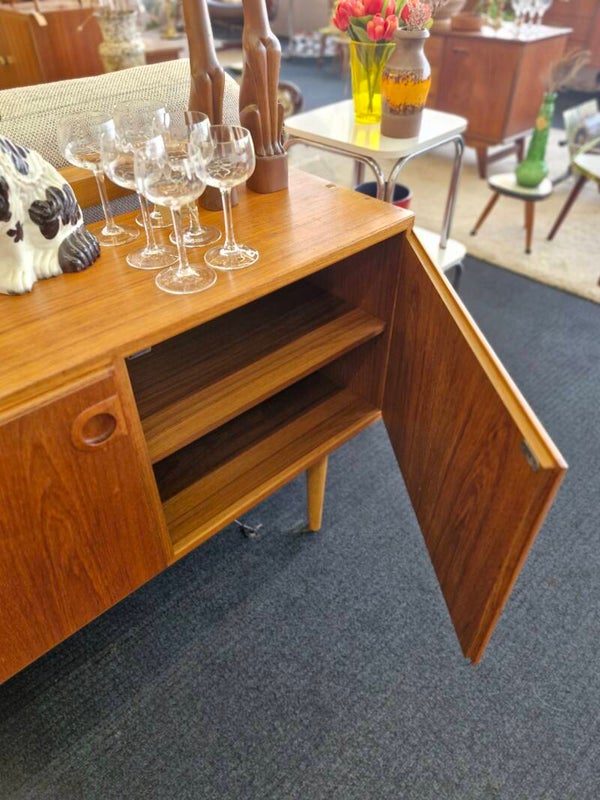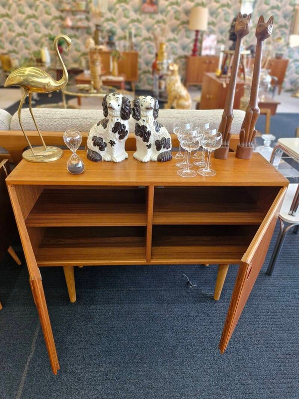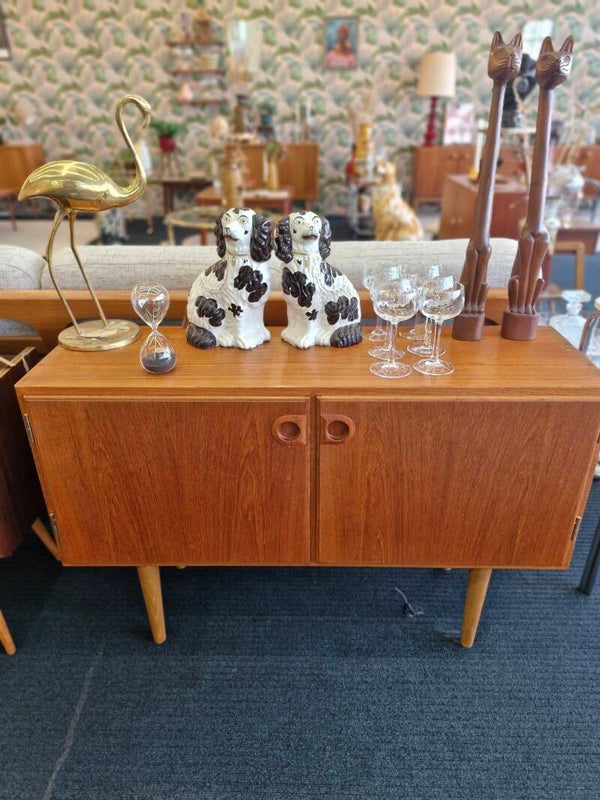 Prachtig vintage kastje met legplank, teak Deens op ronde houten pootjes en met schitterend gevormde houten ronde open greepjes. In topstaat! Stijlvolle aanwinst die heel wat hoekjes in huis een gezellige vintage twist geeft.