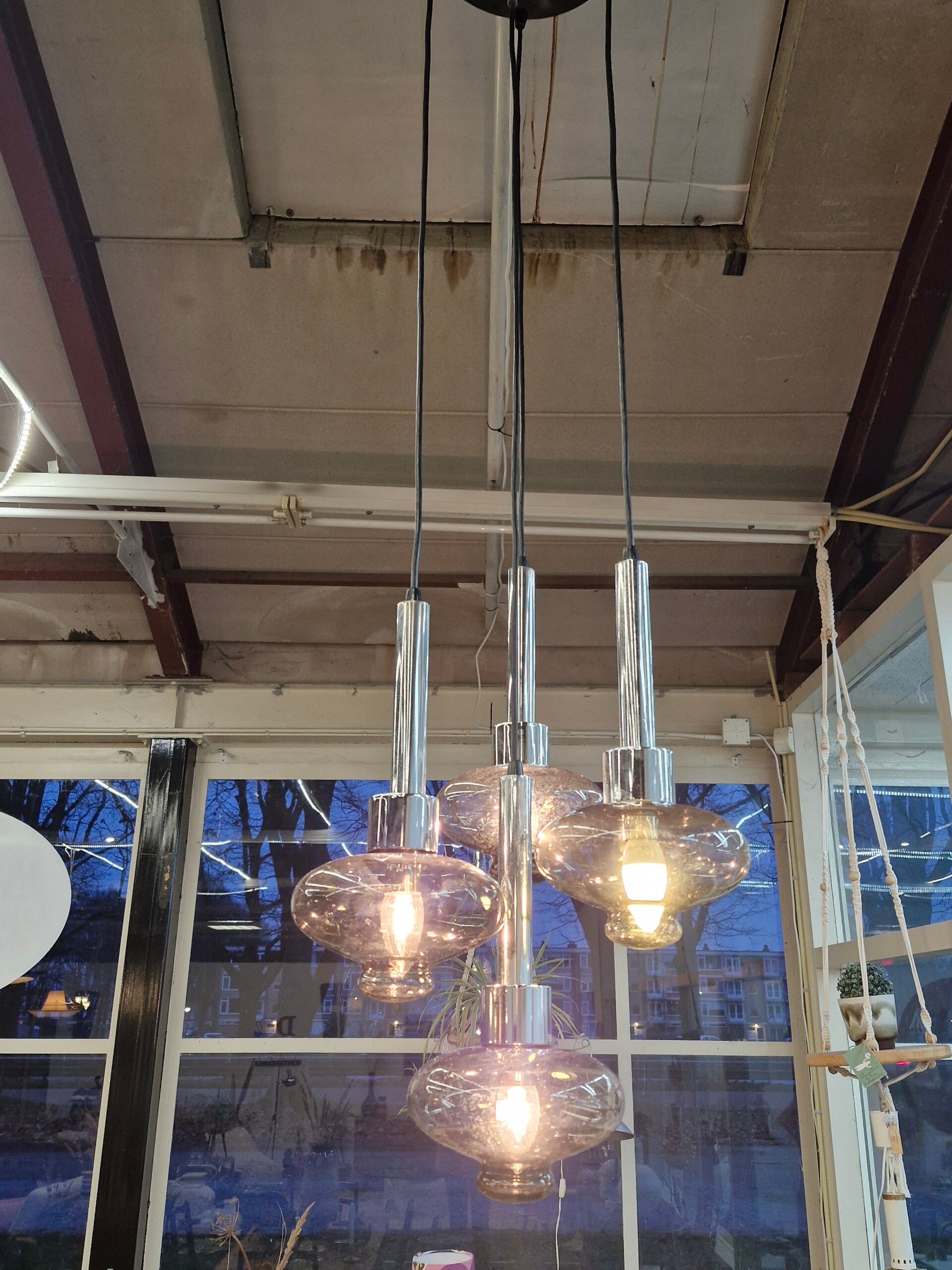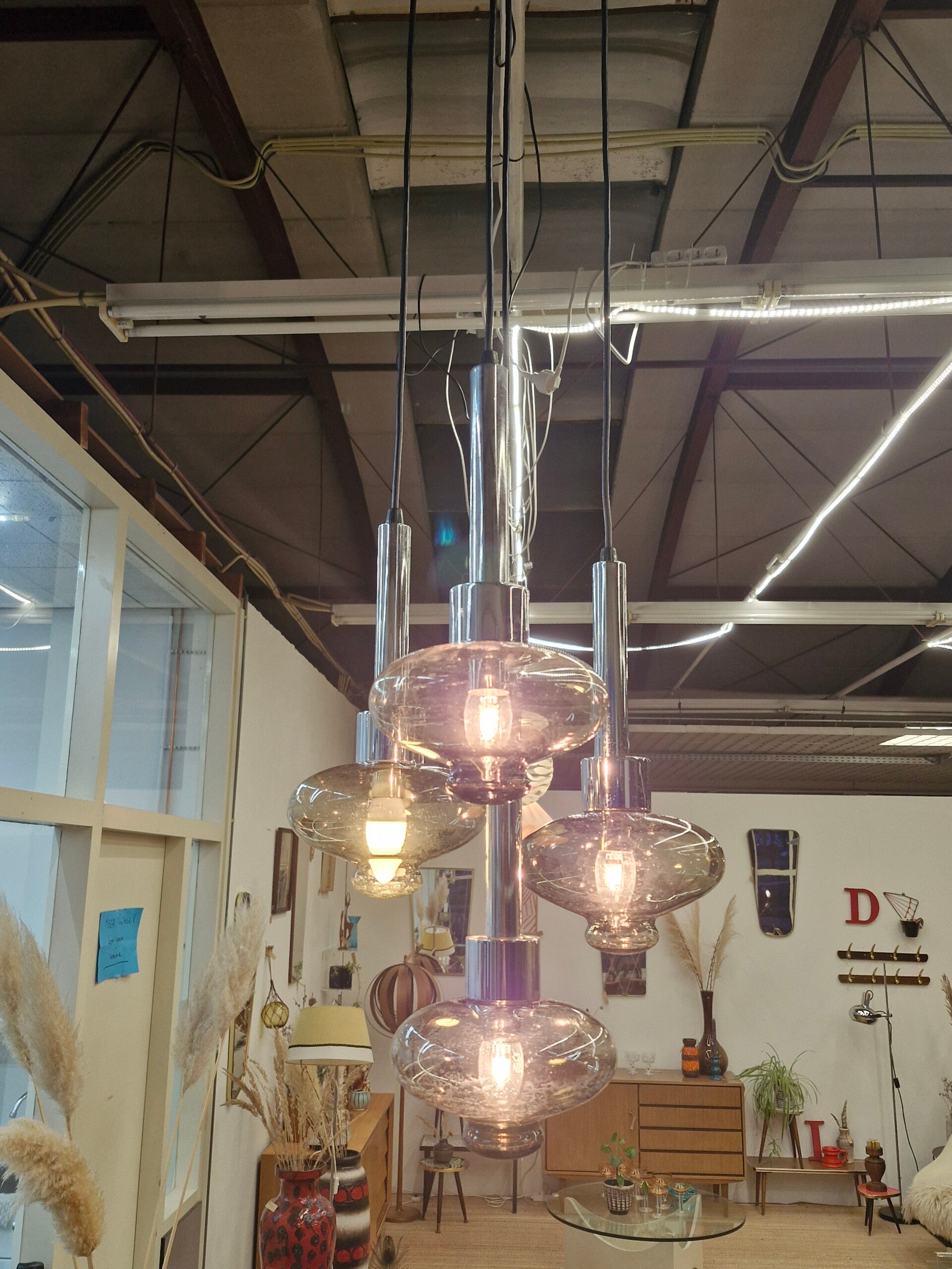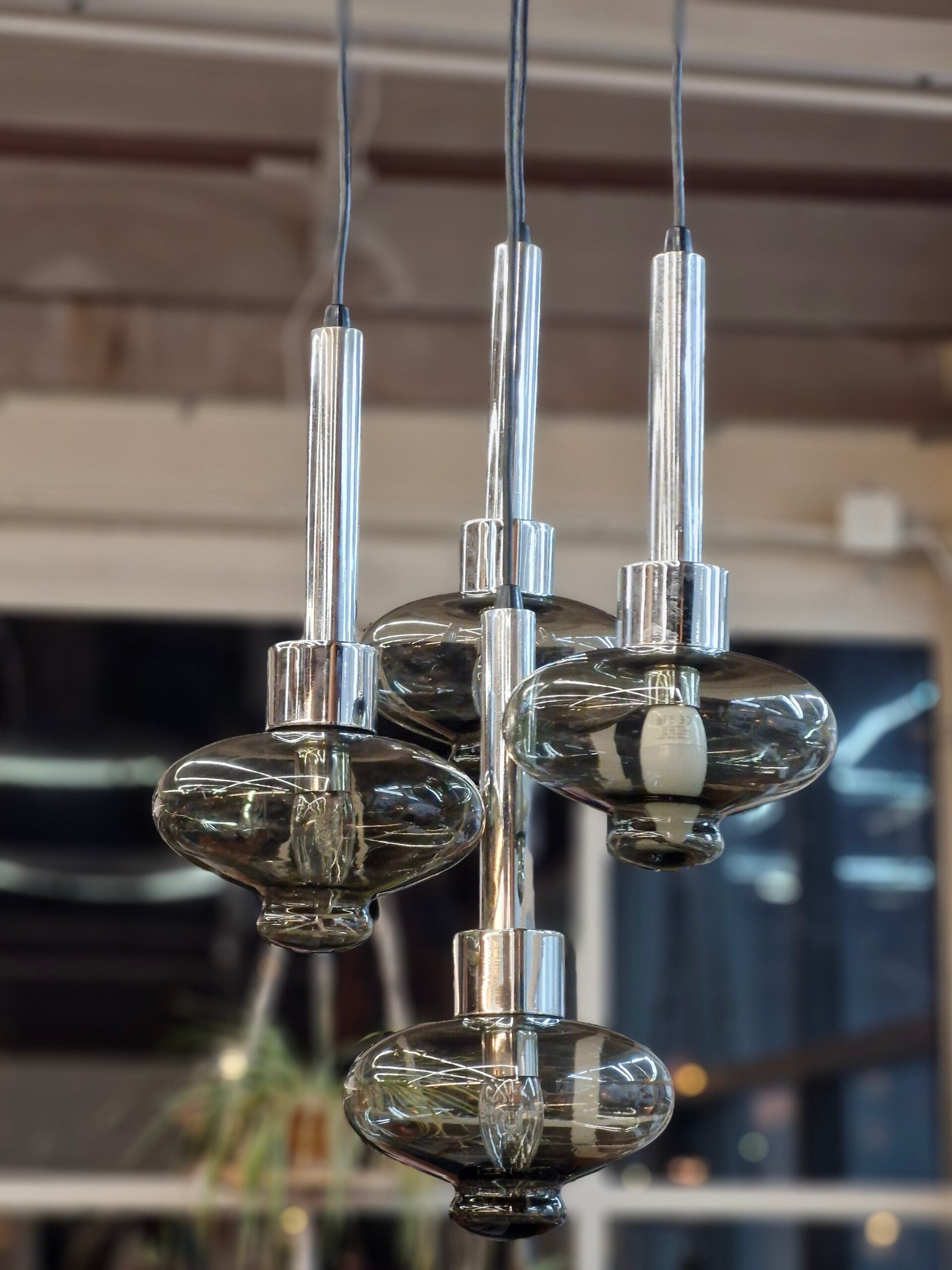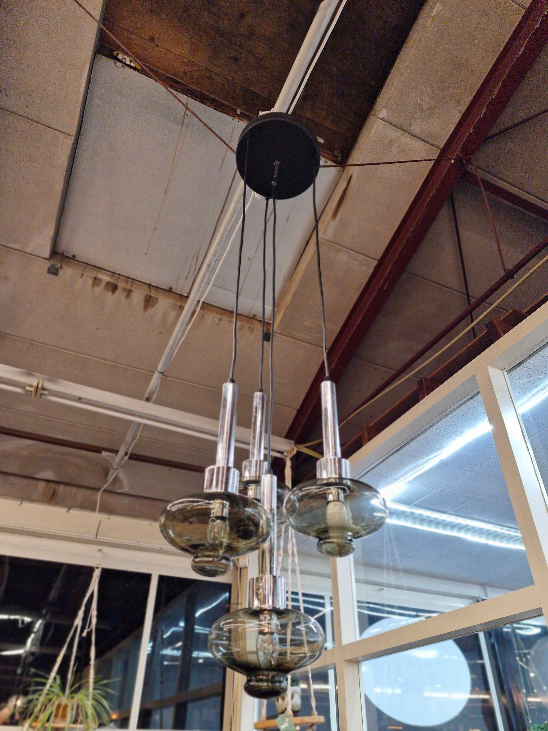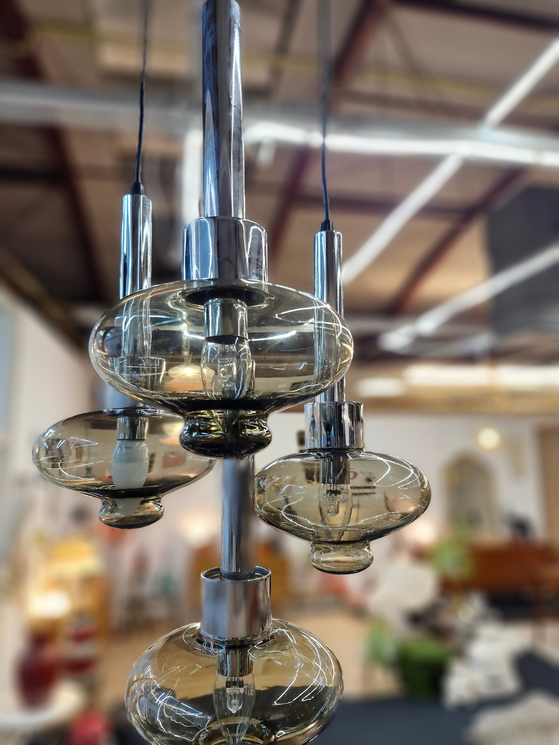Mooie vintage space age luster / hanglamp uit de seventies uitgevoerd in rookglas met chroom. Het ophangsysteem / armatuur is rond en zwart. Deze prachtige lamp is in uitstekende conditie.