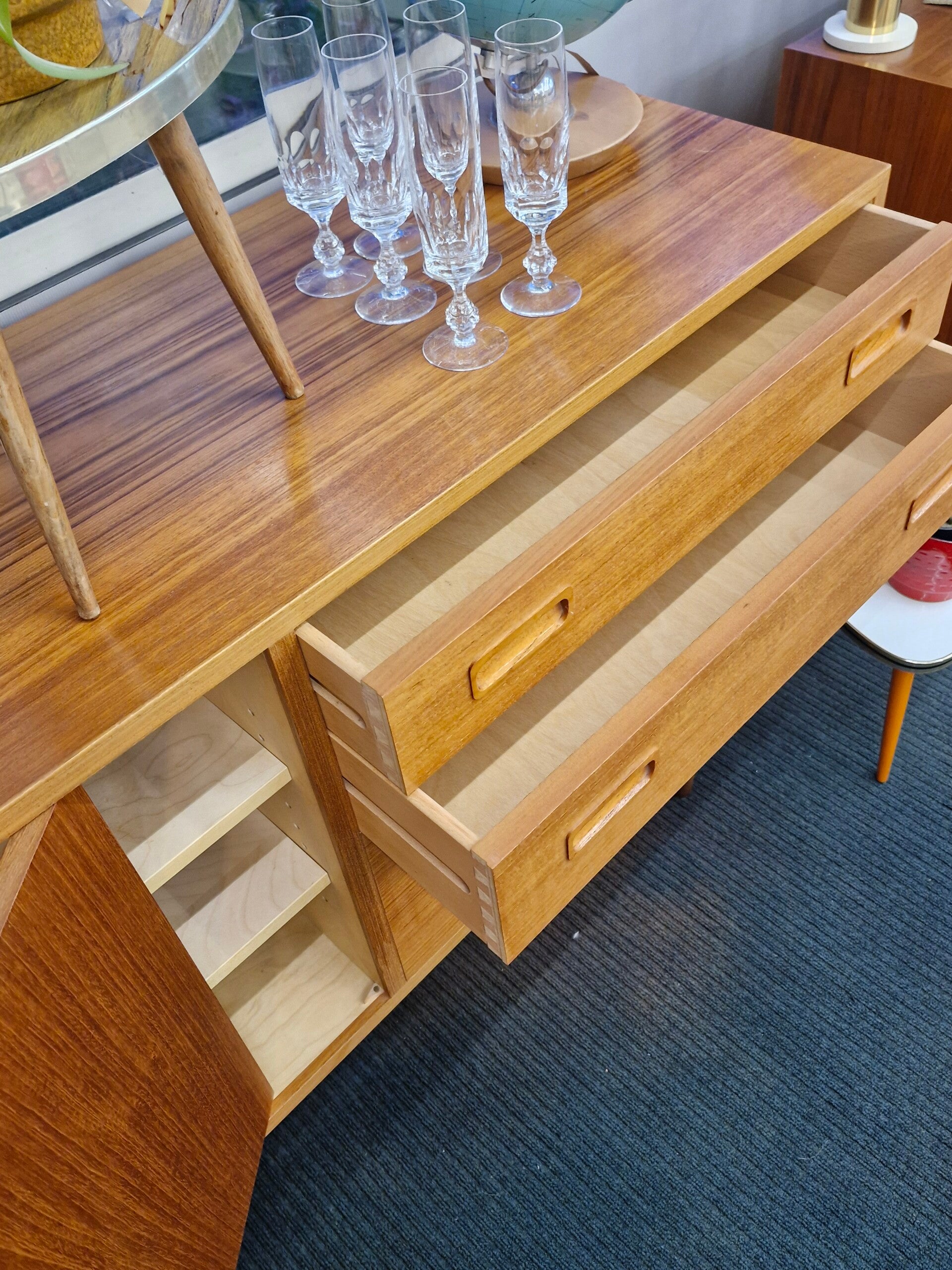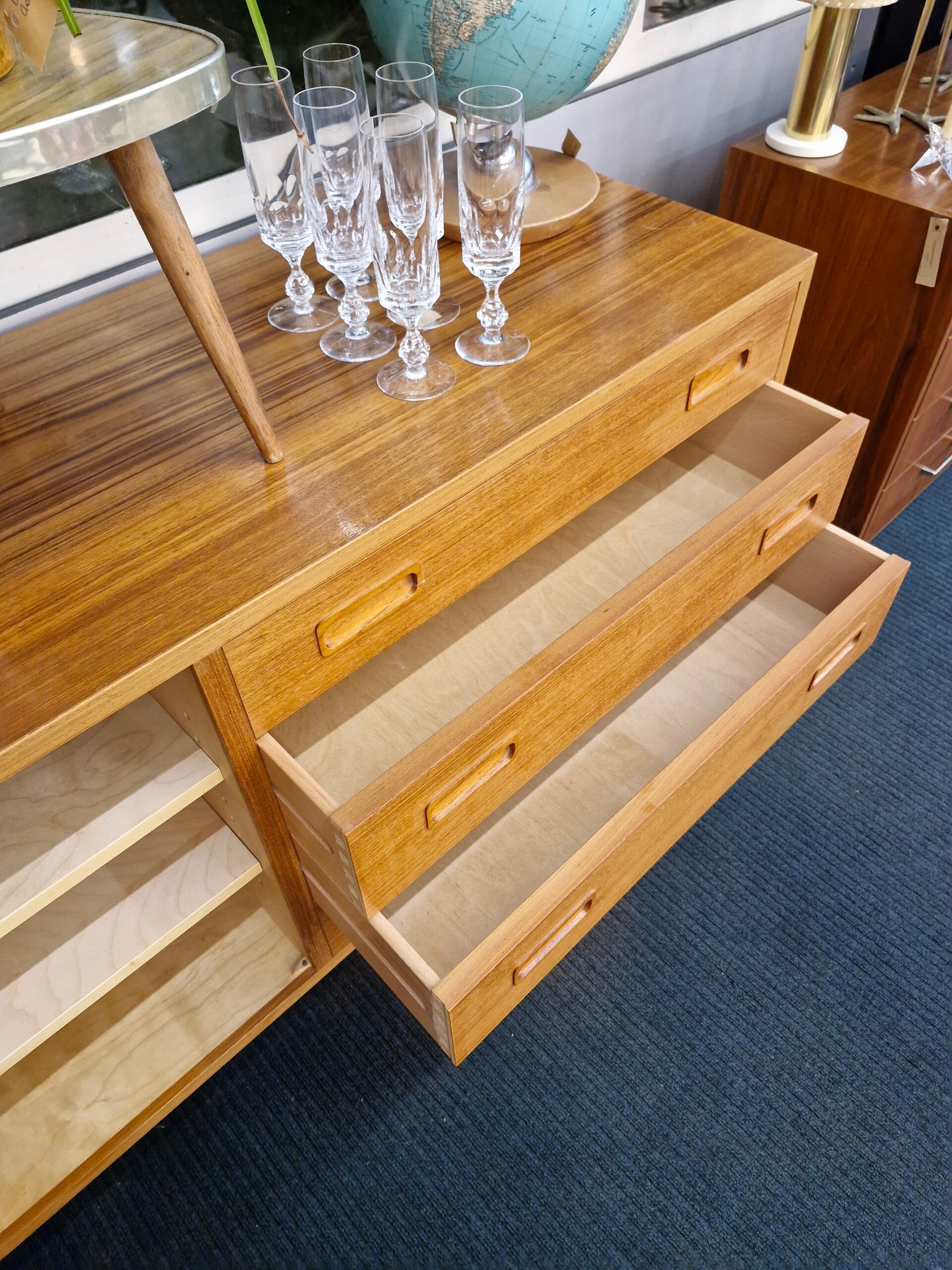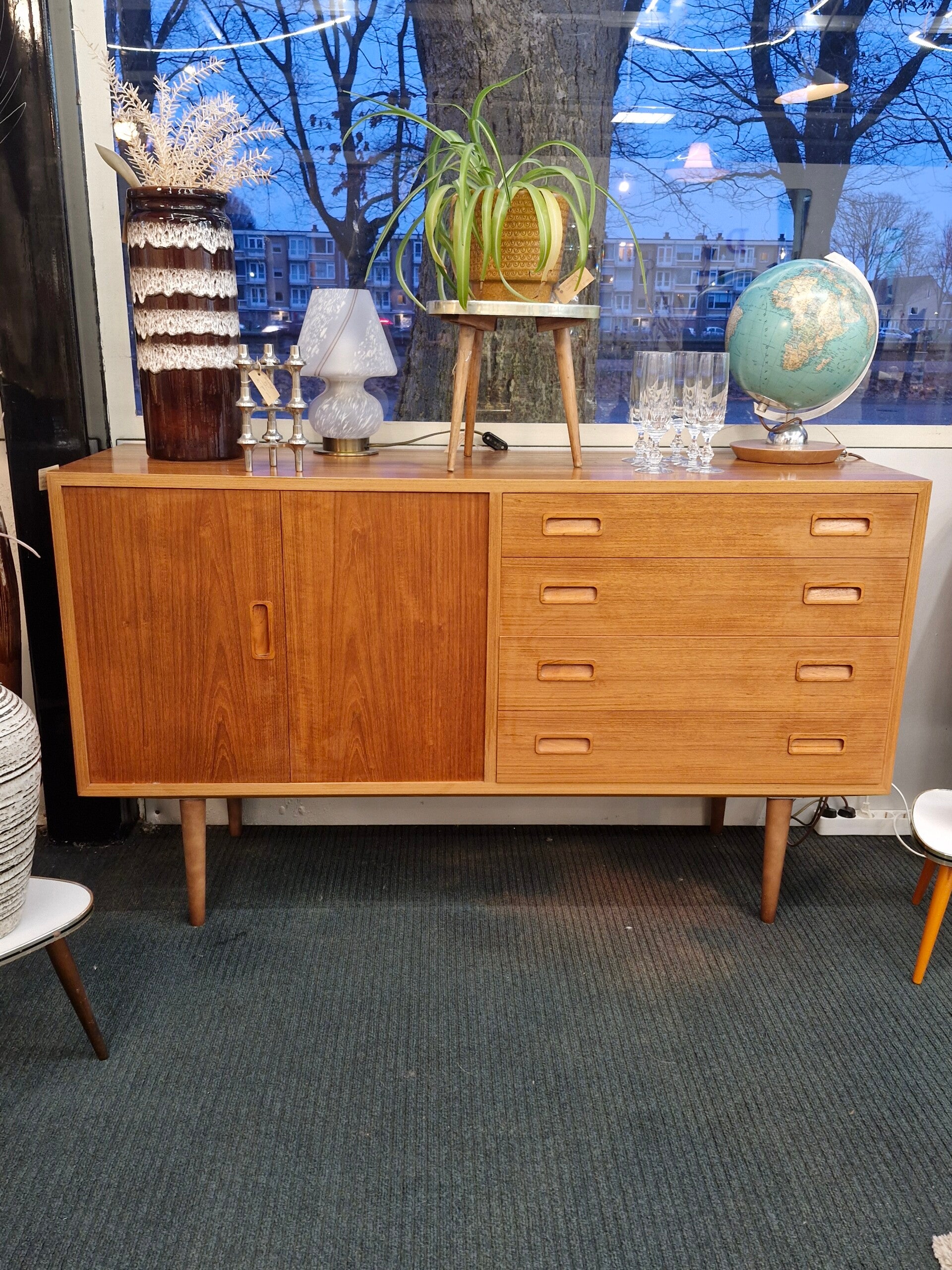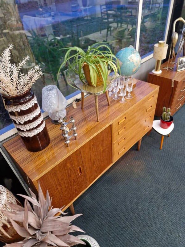 Prachtig vintage dressoir, Deens design van Poul Hundevad, teakhout jaren 70. Bijzonder mooi model met aan de linkerzijde een harmonica deurt en rechts vier lades. Gemerkt aan achterzijde, mooie verbindingen in de lades. Topkwaliteit en in uitstekende conditie, nagenoeg geen gebruikssporen.