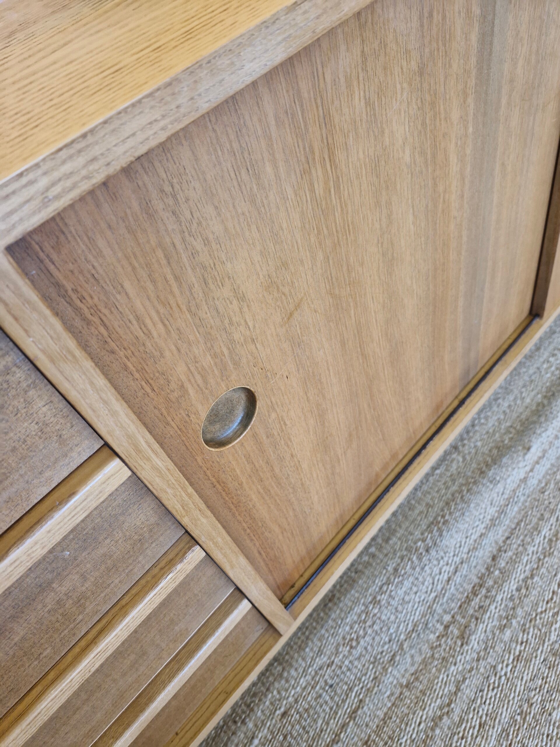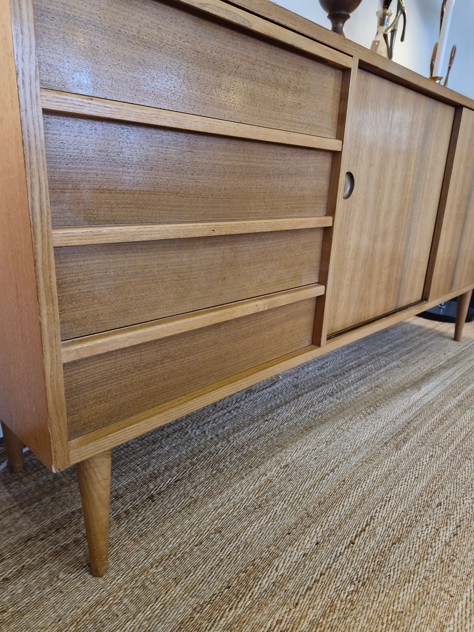 Prachtig mid century sideboard / dressoir uit de seventies van blonde houtsoort. Bijzonder mooi gevormde lades, ruimtebesparende soepele schuifdeuren met ronde green en op houten pootjes. In zeer mooie vintage conditie, lichte gebruikssporen passend bij de leeftijd.