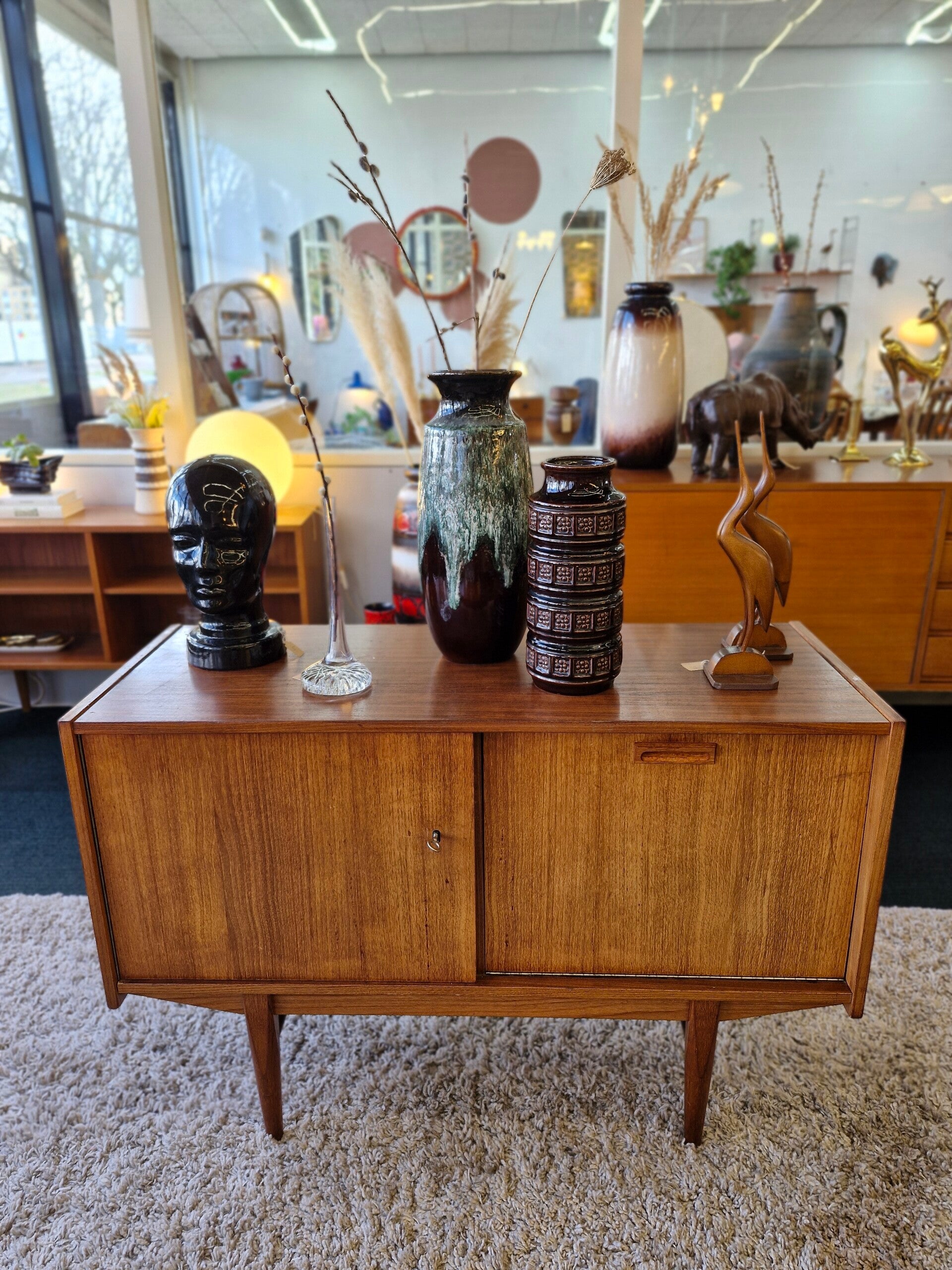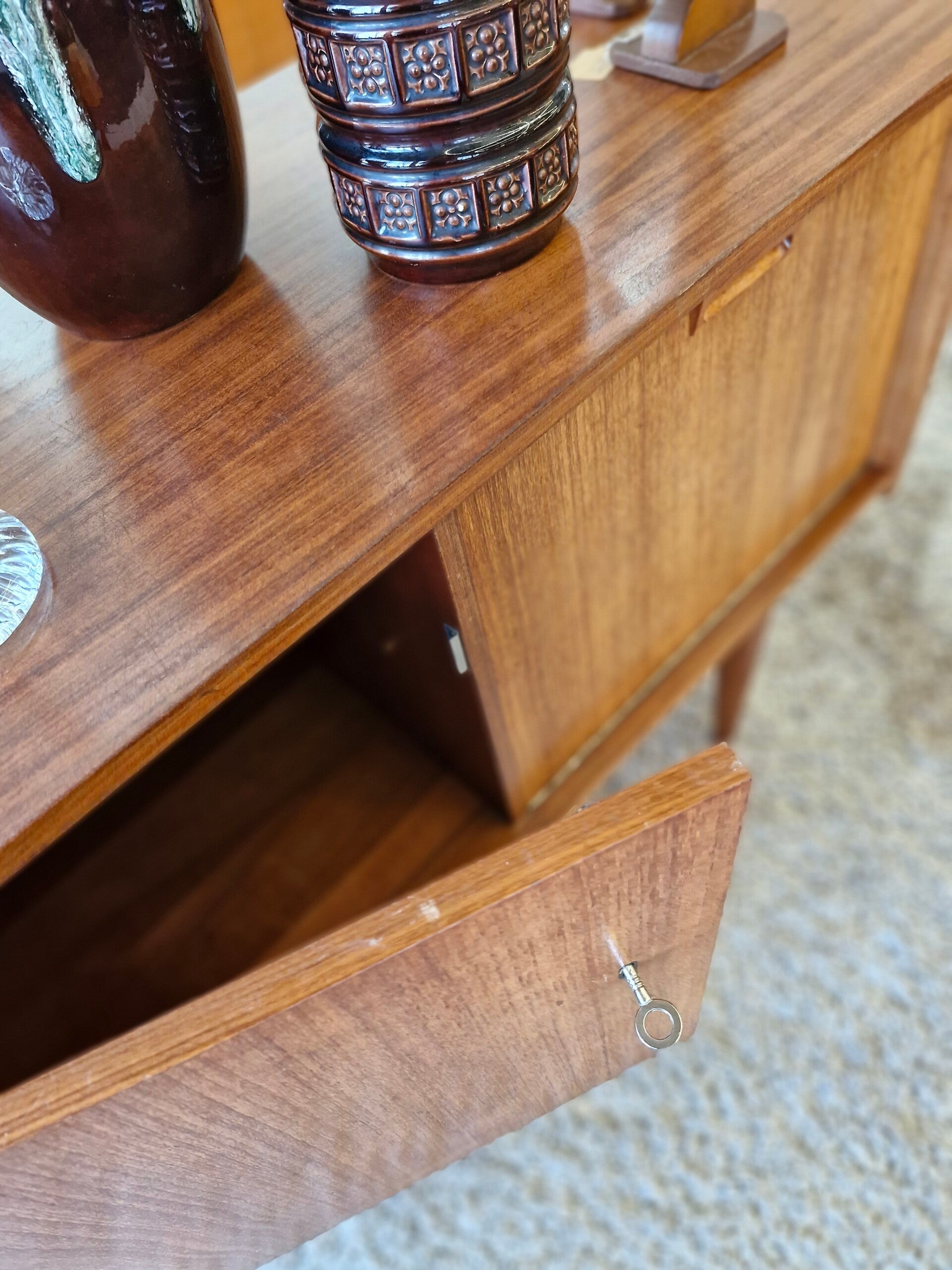 Super leuk vintage platenkastje / klein dressoir van het Nederlandse meubelmerk Fristho uit de jaren 70. Perfect om je platenspeler op te zetten en je mooiste lps in op te bergen. Inclusief sleutel en werkend slot. In mooie conditie, lichte gebruikssporen passend bij zijn leeftijd.