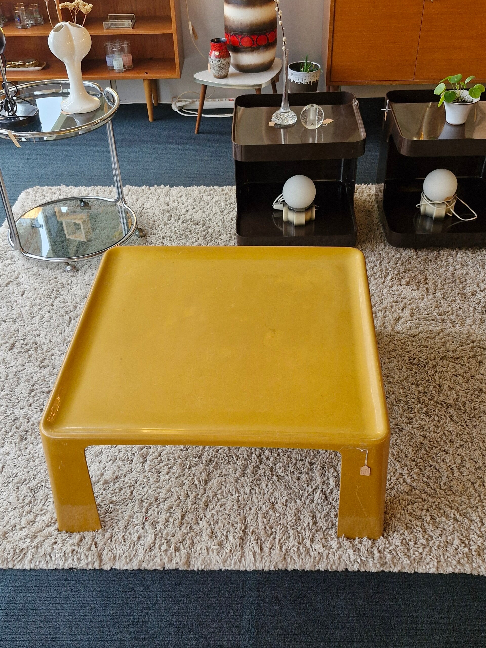 Prachtige vormgegeven grote vintage salontafel space age okergeel van Gati Mario Bellini 60s/70s, geproduceerd door B&B Italia. Type Amante. Deze blikvanger heeft lichte gebruikssporen, passend bij zijn leeftijd.